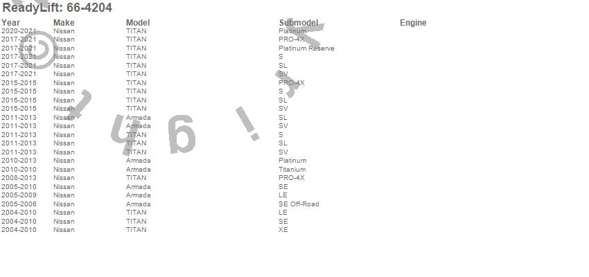 Below is an abreviated list of applications for the 2.0 in. Front Leveling Kit. Armada, Titan, Nissan, 2013, 2012, 2011, 2010, 2009, 2008, 2007, 2006, 2005, 2004 more…