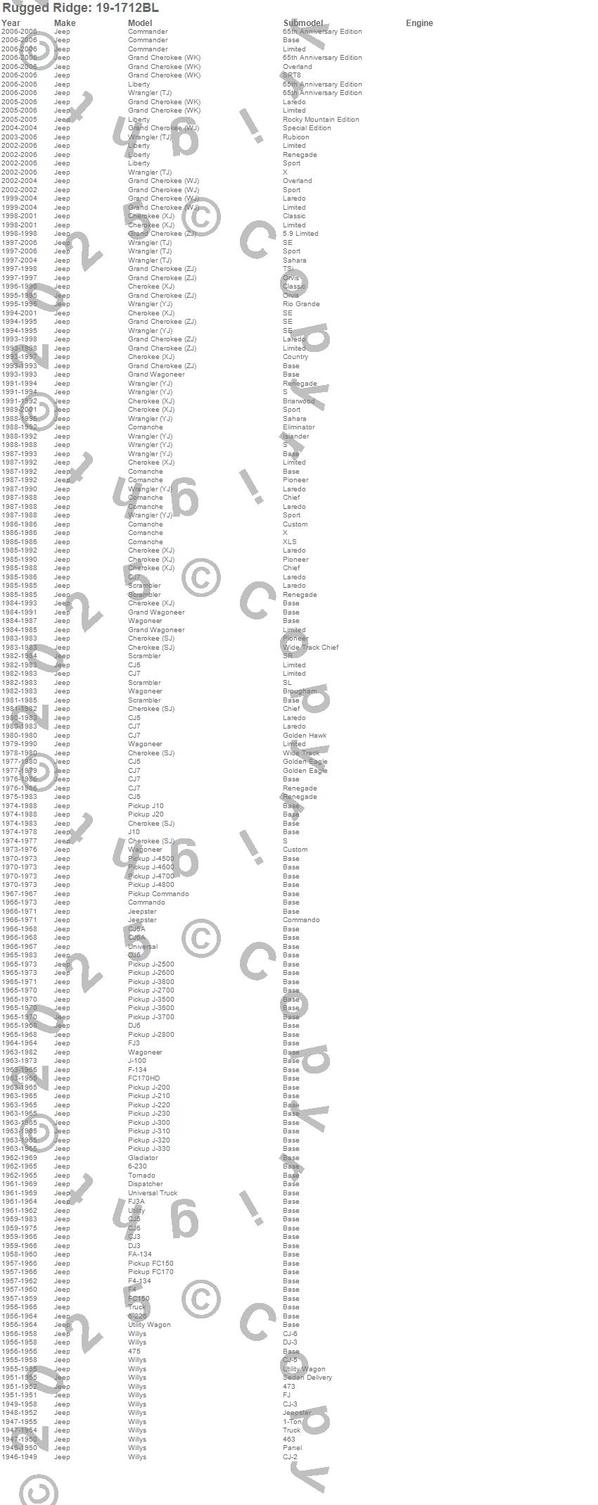 1-Ton Pickup, 475, 6-226, 6-230, Cherokee (SJ), Cherokee (XJ), CJ-2A, CJ-3A, CJ-3B, CJ3, CJ5, CJ5A, CJ6, CJ6A, CJ7, Comanche, Commander, Commando, Dispatcher, DJ-3A more…