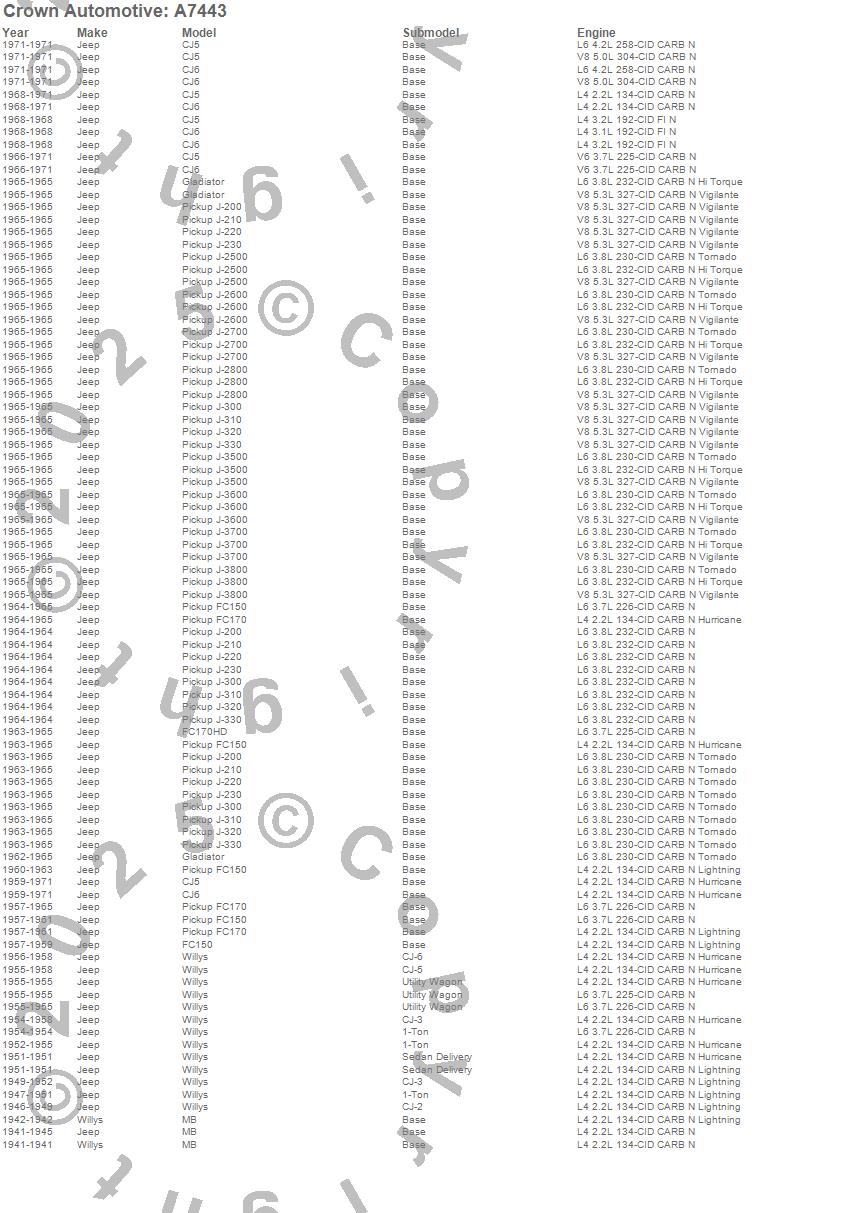 1-Ton Pickup, CJ-2A, CJ-3A, CJ-3B, CJ5, CJ6, FC150, FC170, FC170HD, Gladiator, J-200, J-210, J-220, J-230, J-2500, J-2600, J-2700, J-2800, J-300, J-310 more…