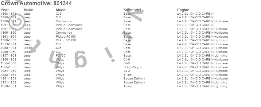 Crown Automotive is the premier manufacturer and distributor of quality replacement parts for Jeep® CJ™, Wrangler™, Cherokee™, Grand Cherokee™, Liberty™, and Commander™."From humble beginnings in 1963 in a small Boston storefront, Crown Automotive has consistently maintained its commitment to offering only quality parts and exceptional service. Today, with warehouses in Massachusetts, Georgia, Nevada, Spain, and the Czech Republic, totaling over 160,000 square feet, Crown Automotive continues to be the leader in quality replacement parts for Jeep® vehicles. With over 8,000 different parts in stock for Jeep® vehicles from 1942 on up, Crown has the largest stock of replacement parts for Jeep® vehicles, including factory-discontinued parts. In fact, many of the older Jeeps are still on (and off) the road thanks to Crown parts. The Crown line consists of axle, body, brake, clutch, cooling, driveline, electrical, engine, exhaust, fuel, steering, suspension, transmission and transfer case components. Crown Automotive also offers an exclusive line of component kits and accessory products. Because we know that Jeeps are driven harder than most other vehicles, we emphasize offering only quality parts. In fact, we test parts on Jeeps before distributing them to our dealers to insure that they meet our standards for quality. Crown also supports its entire line with a 12 month/12,000 mile warranty to insure our dealers and their customers of our commitment to offering quality parts. We know from experience that Jeep® owners would rather pay a little more for a good quality part that's backed by a strong guarantee. But we know that price is important as well. So, not only will you find Crown parts to be of exceptional quality, but you'll find them at a great price too.