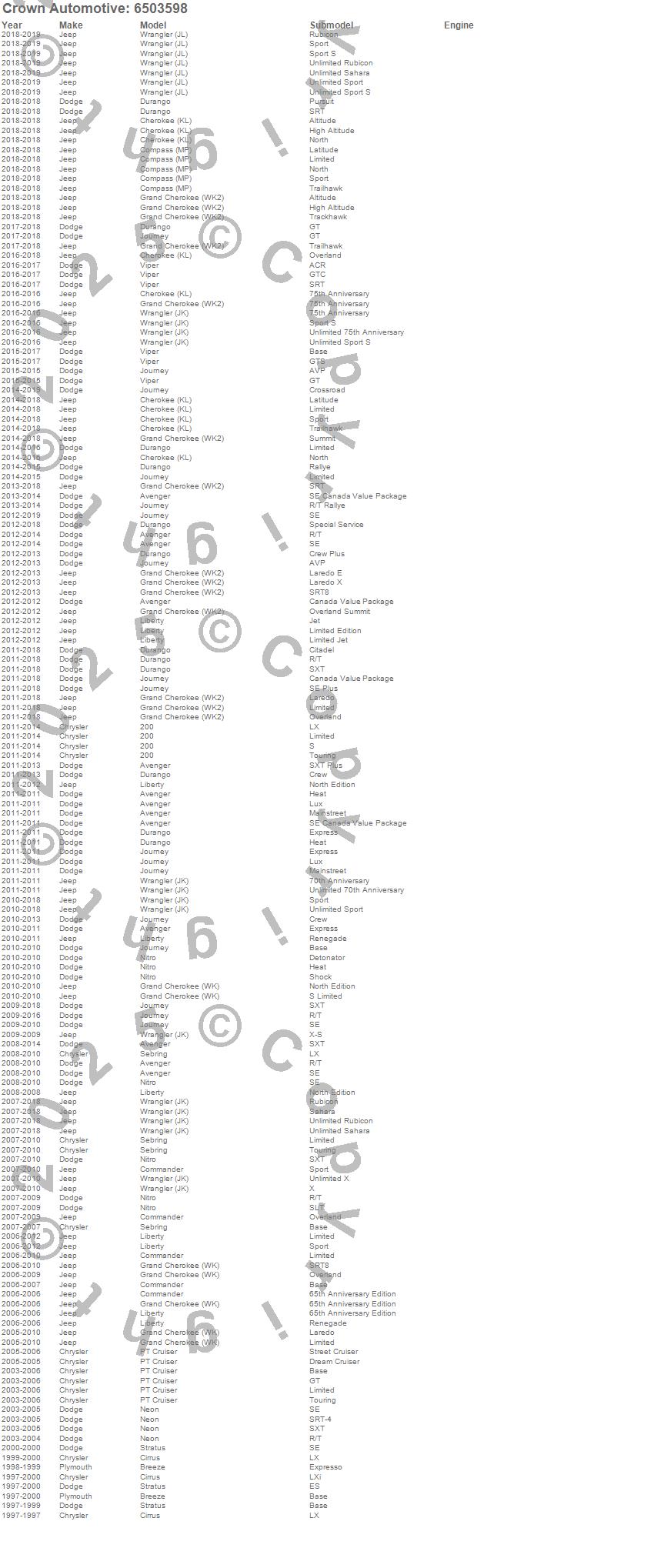 200, Avenger, Breeze, Cherokee (KL), Cirrus, Commander, Durango, Grand Cherokee (WK), Grand Cherokee (WK2), Journey, Liberty, Neon, Nitro, PT Cruiser, Sebring, Stratus, Viper, Wrangler (JK), Chrysler, Dodge more…