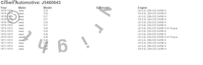 Crown Automotive is the premier manufacturer and distributor of quality replacement parts for Jeep® CJ™, Wrangler™, Cherokee™, Grand Cherokee™, Liberty™, and Commander™."From humble beginnings in 1963 in a small Boston storefront, Crown Automotive has consistently maintained its commitment to offering only quality parts and exceptional service. Today, with warehouses in Massachusetts, Georgia, Nevada, Spain, and the Czech Republic, totaling over 160,000 square feet, Crown Automotive continues to be the leader in quality replacement parts for Jeep® vehicles. With over 8,000 different parts in stock for Jeep® vehicles from 1942 on up, Crown has the largest stock of replacement parts for Jeep® vehicles, including factory-discontinued parts. In fact, many of the older Jeeps are still on (and off) the road thanks to Crown parts. The Crown line consists of axle, body, brake, clutch, cooling, driveline, electrical, engine, exhaust, fuel, steering, suspension, transmission and transfer case components. Crown Automotive also offers an exclusive line of component kits and accessory products. Because we know that Jeeps are driven harder than most other vehicles, we emphasize offering only quality parts. In fact, we test parts on Jeeps before distributing them to our dealers to insure that they meet our standards for quality. Crown also supports its entire line with a 12 month/12,000 mile warranty to insure our dealers and their customers of our commitment to offering quality parts. We know from experience that Jeep® owners would rather pay a little more for a good quality part that's backed by a strong guarantee. But we know that price is important as well. So, not only will you find Crown parts to be of exceptional quality, but you'll find them at a great price too.