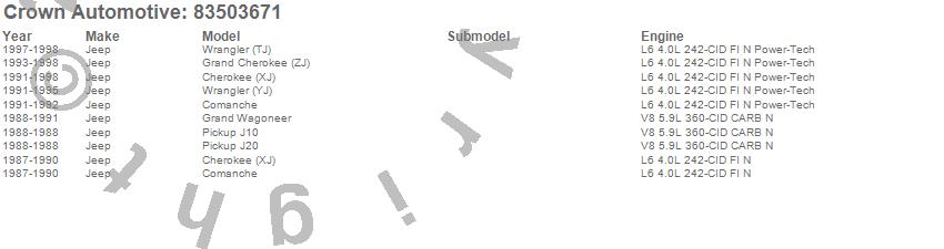 Cherokee (XJ), Comanche, Grand Cherokee (ZJ), Grand Wagoneer, J10, J20, Wrangler (TJ), Wrangler (YJ), Jeep, 1998, 1997, 1996, 1995, 1994, 1993, 1992, 1991, 1990, 1989, 1988 more…