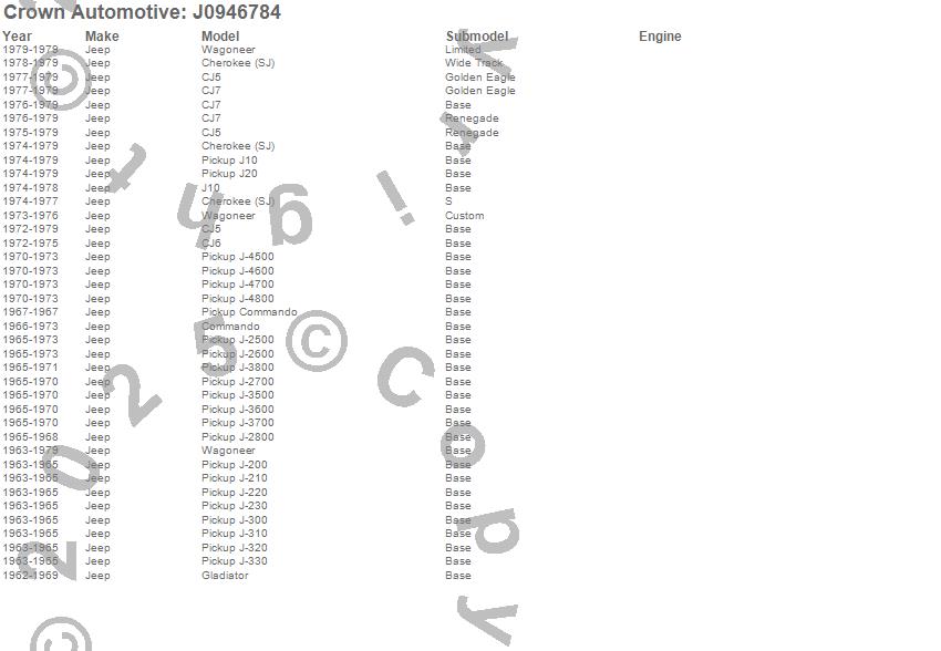 Cherokee (SJ), CJ5, CJ6, CJ7, Commando, Gladiator, J-200, J-210, J-220, J-230, J-2500, J-2600, J-2700, J-2800, J-300, J-310, J-320, J-330, J-3500, J-3600 more…