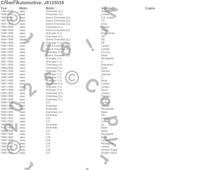 Cherokee (XJ), CJ5, CJ7, Grand Cherokee (ZJ), Scrambler, Wrangler (YJ), Jeep, 2000, 1999, 1998, 1997, 1996, 1995, 1994, 1993, 1992, 1991, 1990, 1989, 1988 more…