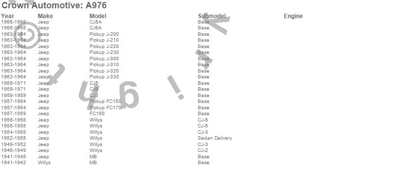 Crown Automotive is the premier manufacturer and distributor of quality replacement parts for Jeep® CJ™, Wrangler™, Cherokee™, Grand Cherokee™, Liberty™, and Commander™."From humble beginnings in 1963 in a small Boston storefront, Crown Automotive has consistently maintained its commitment to offering only quality parts and exceptional service. Today, with warehouses in Massachusetts, Georgia, Nevada, Spain, and the Czech Republic, totaling over 160,000 square feet, Crown Automotive continues to be the leader in quality replacement parts for Jeep® vehicles. With over 8,000 different parts in stock for Jeep® vehicles from 1942 on up, Crown has the largest stock of replacement parts for Jeep® vehicles, including factory-discontinued parts. In fact, many of the older Jeeps are still on (and off) the road thanks to Crown parts. The Crown line consists of axle, body, brake, clutch, cooling, driveline, electrical, engine, exhaust, fuel, steering, suspension, transmission and transfer case components. Crown Automotive also offers an exclusive line of component kits and accessory products. Because we know that Jeeps are driven harder than most other vehicles, we emphasize offering only quality parts. In fact, we test parts on Jeeps before distributing them to our dealers to insure that they meet our standards for quality. Crown also supports its entire line with a 12 month/12,000 mile warranty to insure our dealers and their customers of our commitment to offering quality parts. We know from experience that Jeep® owners would rather pay a little more for a good quality part that's backed by a strong guarantee. But we know that price is important as well. So, not only will you find Crown parts to be of exceptional quality, but you'll find them at a great price too.