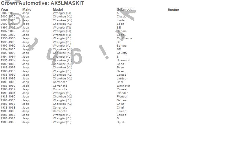 Crown Automotive Transmission Kit AX5LMASKIT Features: