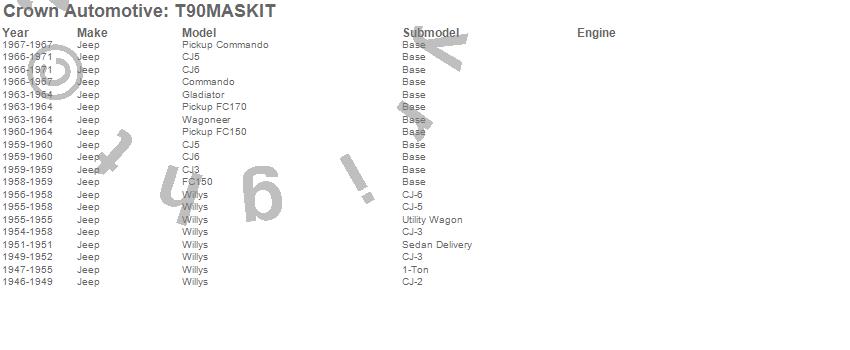 Crown Automotive Transmission Kit T90MASKIT Features: