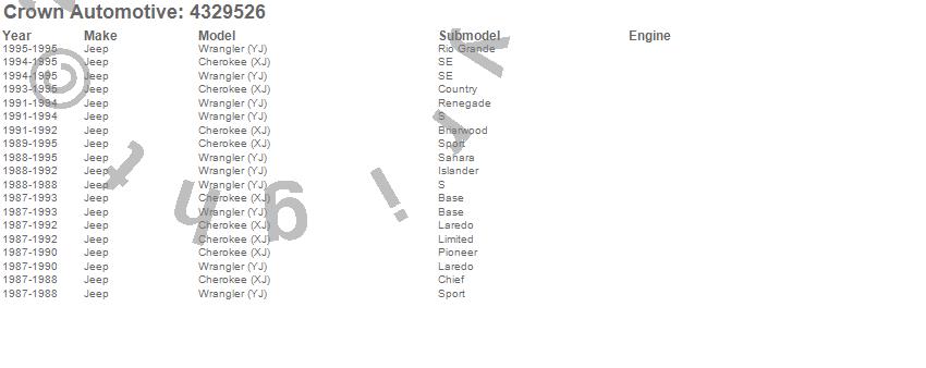 Crown Automotive is the premier manufacturer and distributor of quality replacement parts for Jeep® CJ™, Wrangler™, Cherokee™, Grand Cherokee™, Liberty™, and Commander™."From humble beginnings in 1963 in a small Boston storefront, Crown Automotive has consistently maintained its commitment to offering only quality parts and exceptional service. Today, with warehouses in Massachusetts, Georgia, Nevada, Spain, and the Czech Republic, totaling over 160,000 square feet, Crown Automotive continues to be the leader in quality replacement parts for Jeep® vehicles. With over 8,000 different parts in stock for Jeep® vehicles from 1942 on up, Crown has the largest stock of replacement parts for Jeep® vehicles, including factory-discontinued parts. In fact, many of the older Jeeps are still on (and off) the road thanks to Crown parts. The Crown line consists of axle, body, brake, clutch, cooling, driveline, electrical, engine, exhaust, fuel, steering, suspension, transmission and transfer case components. Crown Automotive also offers an exclusive line of component kits and accessory products. Because we know that Jeeps are driven harder than most other vehicles, we emphasize offering only quality parts. In fact, we test parts on Jeeps before distributing them to our dealers to insure that they meet our standards for quality. Crown also supports its entire line with a 12 month/12,000 mile warranty to insure our dealers and their customers of our commitment to offering quality parts. We know from experience that Jeep® owners would rather pay a little more for a good quality part that's backed by a strong guarantee. But we know that price is important as well. So, not only will you find Crown parts to be of exceptional quality, but you'll find them at a great price too.