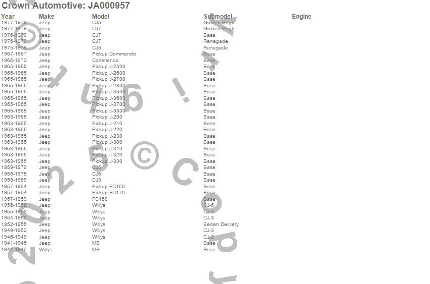 Crown Automotive is the premier manufacturer and distributor of quality replacement parts for Jeep® CJ™, Wrangler™, Cherokee™, Grand Cherokee™, Liberty™, and Commander™."From humble beginnings in 1963 in a small Boston storefront, Crown Automotive has consistently maintained its commitment to offering only quality parts and exceptional service. Today, with warehouses in Massachusetts, Georgia, Nevada, Spain, and the Czech Republic, totaling over 160,000 square feet, Crown Automotive continues to be the leader in quality replacement parts for Jeep® vehicles. With over 8,000 different parts in stock for Jeep® vehicles from 1942 on up, Crown has the largest stock of replacement parts for Jeep® vehicles, including factory-discontinued parts. In fact, many of the older Jeeps are still on (and off) the road thanks to Crown parts. The Crown line consists of axle, body, brake, clutch, cooling, driveline, electrical, engine, exhaust, fuel, steering, suspension, transmission and transfer case components. Crown Automotive also offers an exclusive line of component kits and accessory products. Because we know that Jeeps are driven harder than most other vehicles, we emphasize offering only quality parts. In fact, we test parts on Jeeps before distributing them to our dealers to insure that they meet our standards for quality. Crown also supports its entire line with a 12 month/12,000 mile warranty to insure our dealers and their customers of our commitment to offering quality parts. We know from experience that Jeep® owners would rather pay a little more for a good quality part that's backed by a strong guarantee. But we know that price is important as well. So, not only will you find Crown parts to be of exceptional quality, but you'll find them at a great price too.