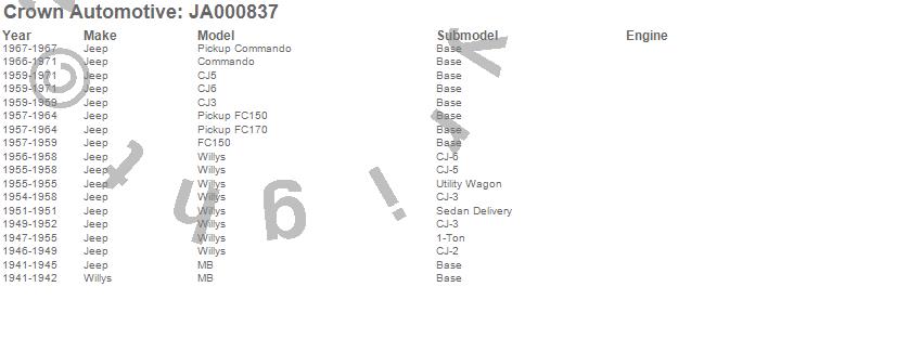 Crown Automotive is the premier manufacturer and distributor of quality replacement parts for Jeep® CJ™, Wrangler™, Cherokee™, Grand Cherokee™, Liberty™, and Commander™."From humble beginnings in 1963 in a small Boston storefront, Crown Automotive has consistently maintained its commitment to offering only quality parts and exceptional service. Today, with warehouses in Massachusetts, Georgia, Nevada, Spain, and the Czech Republic, totaling over 160,000 square feet, Crown Automotive continues to be the leader in quality replacement parts for Jeep® vehicles. With over 8,000 different parts in stock for Jeep® vehicles from 1942 on up, Crown has the largest stock of replacement parts for Jeep® vehicles, including factory-discontinued parts. In fact, many of the older Jeeps are still on (and off) the road thanks to Crown parts. The Crown line consists of axle, body, brake, clutch, cooling, driveline, electrical, engine, exhaust, fuel, steering, suspension, transmission and transfer case components. Crown Automotive also offers an exclusive line of component kits and accessory products. Because we know that Jeeps are driven harder than most other vehicles, we emphasize offering only quality parts. In fact, we test parts on Jeeps before distributing them to our dealers to insure that they meet our standards for quality. Crown also supports its entire line with a 12 month/12,000 mile warranty to insure our dealers and their customers of our commitment to offering quality parts. We know from experience that Jeep® owners would rather pay a little more for a good quality part that's backed by a strong guarantee. But we know that price is important as well. So, not only will you find Crown parts to be of exceptional quality, but you'll find them at a great price too.