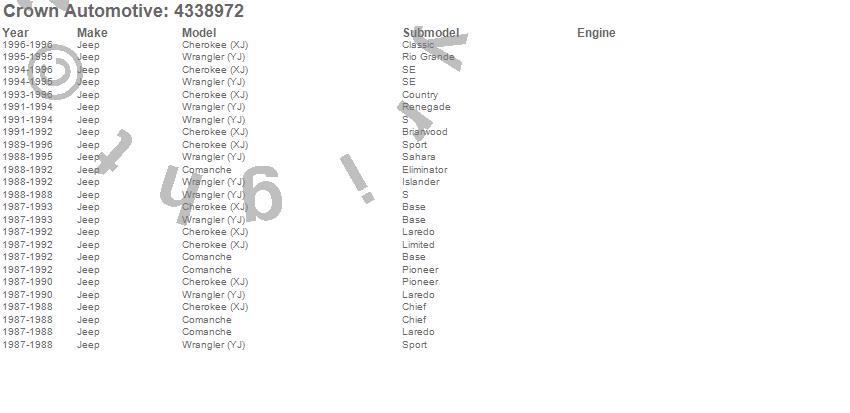 Crown Automotive is the premier manufacturer and distributor of quality replacement parts for Jeep® CJ™, Wrangler™, Cherokee™, Grand Cherokee™, Liberty™, and Commander™."From humble beginnings in 1963 in a small Boston storefront, Crown Automotive has consistently maintained its commitment to offering only quality parts and exceptional service. Today, with warehouses in Massachusetts, Georgia, Nevada, Spain, and the Czech Republic, totaling over 160,000 square feet, Crown Automotive continues to be the leader in quality replacement parts for Jeep® vehicles. With over 8,000 different parts in stock for Jeep® vehicles from 1942 on up, Crown has the largest stock of replacement parts for Jeep® vehicles, including factory-discontinued parts. In fact, many of the older Jeeps are still on (and off) the road thanks to Crown parts. The Crown line consists of axle, body, brake, clutch, cooling, driveline, electrical, engine, exhaust, fuel, steering, suspension, transmission and transfer case components. Crown Automotive also offers an exclusive line of component kits and accessory products. Because we know that Jeeps are driven harder than most other vehicles, we emphasize offering only quality parts. In fact, we test parts on Jeeps before distributing them to our dealers to insure that they meet our standards for quality. Crown also supports its entire line with a 12 month/12,000 mile warranty to insure our dealers and their customers of our commitment to offering quality parts. We know from experience that Jeep® owners would rather pay a little more for a good quality part that's backed by a strong guarantee. But we know that price is important as well. So, not only will you find Crown parts to be of exceptional quality, but you'll find them at a great price too.