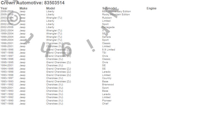 Crown Automotive is the premier manufacturer and distributor of quality replacement parts for Jeep® CJ™, Wrangler™, Cherokee™, Grand Cherokee™, Liberty™, and Commander™."From humble beginnings in 1963 in a small Boston storefront, Crown Automotive has consistently maintained its commitment to offering only quality parts and exceptional service. Today, with warehouses in Massachusetts, Georgia, Nevada, Spain, and the Czech Republic, totaling over 160,000 square feet, Crown Automotive continues to be the leader in quality replacement parts for Jeep® vehicles. With over 8,000 different parts in stock for Jeep® vehicles from 1942 on up, Crown has the largest stock of replacement parts for Jeep® vehicles, including factory-discontinued parts. In fact, many of the older Jeeps are still on (and off) the road thanks to Crown parts. The Crown line consists of axle, body, brake, clutch, cooling, driveline, electrical, engine, exhaust, fuel, steering, suspension, transmission and transfer case components. Crown Automotive also offers an exclusive line of component kits and accessory products. Because we know that Jeeps are driven harder than most other vehicles, we emphasize offering only quality parts. In fact, we test parts on Jeeps before distributing them to our dealers to insure that they meet our standards for quality. Crown also supports its entire line with a 12 month/12,000 mile warranty to insure our dealers and their customers of our commitment to offering quality parts. We know from experience that Jeep® owners would rather pay a little more for a good quality part that's backed by a strong guarantee. But we know that price is important as well. So, not only will you find Crown parts to be of exceptional quality, but you'll find them at a great price too.