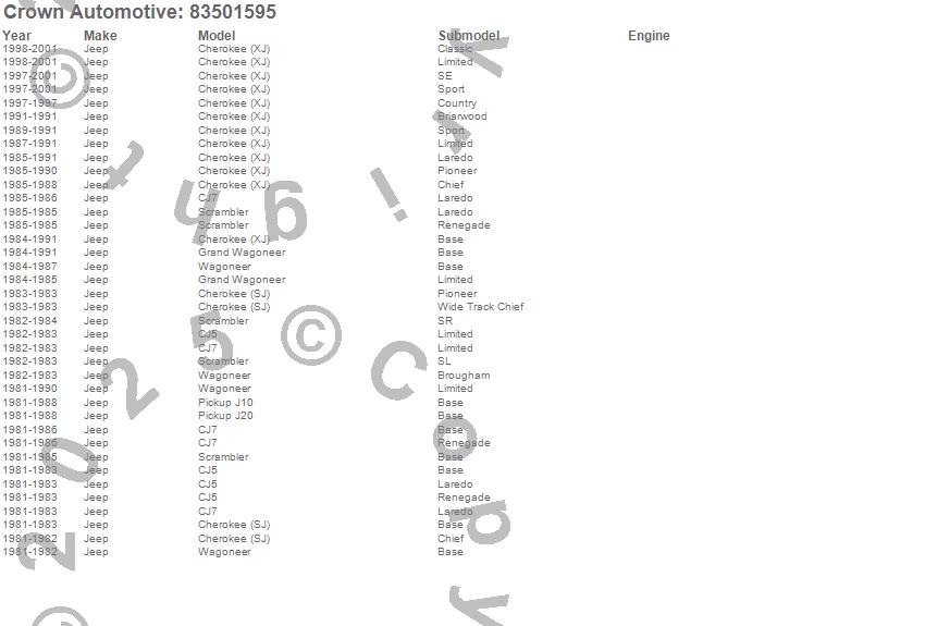 Cherokee (SJ), Cherokee (XJ), CJ5, CJ7, Grand Wagoneer, J10, J20, Scrambler, Wagoneer, Jeep, 2001, 2000, 1999, 1998, 1997, 1991, 1990, 1989, 1988, 1987 more…