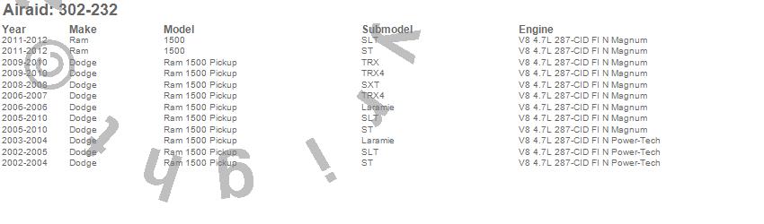 Below is an abreviated list of applications for the AIRAID MXP Series Cold Air Box Intake System.