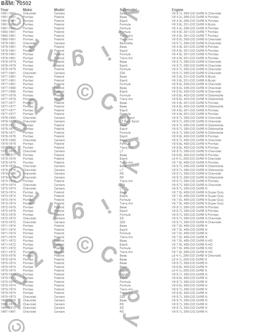 Astro, Bel Air, Biscayne, Blazer, Blazer K5, Brookwood, C10 Pickup, C10 Suburban, C1500 Pickup, C1500 Suburban, C20 Pickup, C20 Suburban, C2500 Pickup, C2500 Suburban, Camaro, Caprice, Chevelle, Corvette, El Camino, Express 1500 more…