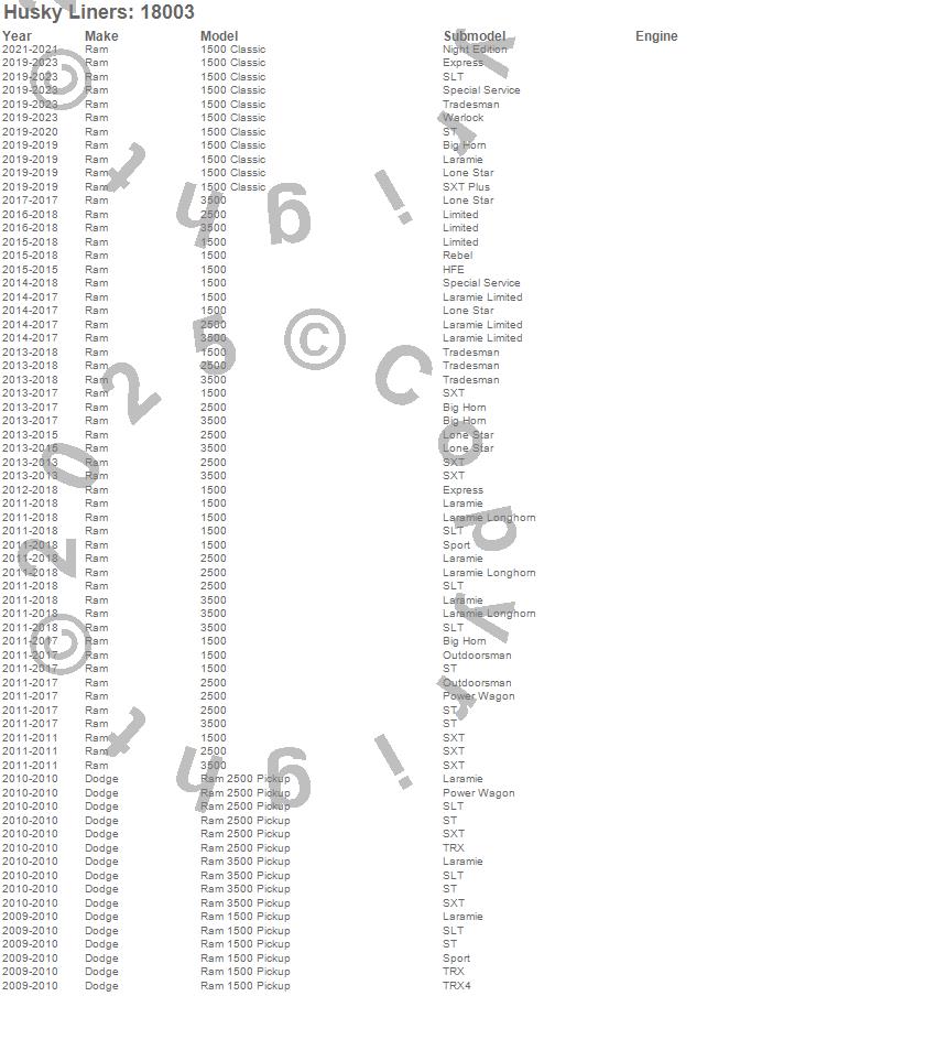 Below is an abreviated list of applications for the WeatherBeater Floor Liner.