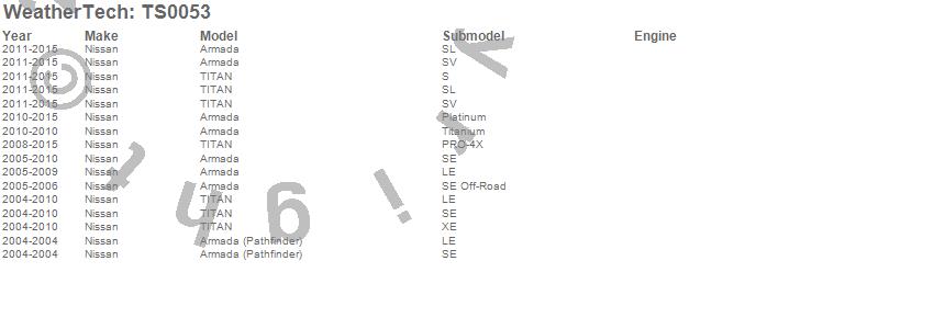 Below is an abreviated list of applications for the WeatherTech TechShade. Armada, Pathfinder, Titan, Nissan, 2015, 2014, 2013, 2012, 2011, 2010, 2009, 2008, 2007, 2006, 2005, 2004 more…