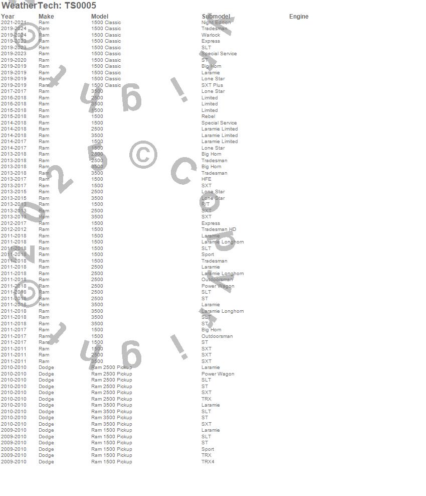 Below is an abreviated list of applications for the WeatherTech TechShade. 1500, 2500, 3500, Ram 1500, Ram 2500, Ram 3500, Dodge, Ram, 2015, 2014, 2013, 2012, 2011, 2010, 2009 more…