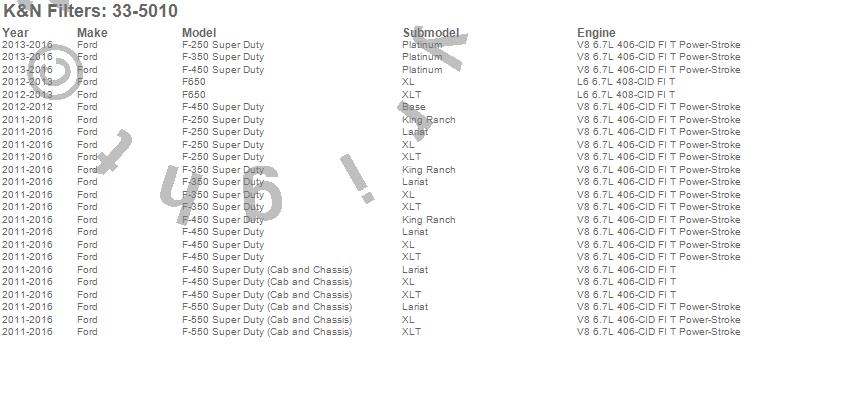 Below is an abreviated list of applications for the Air Filter.