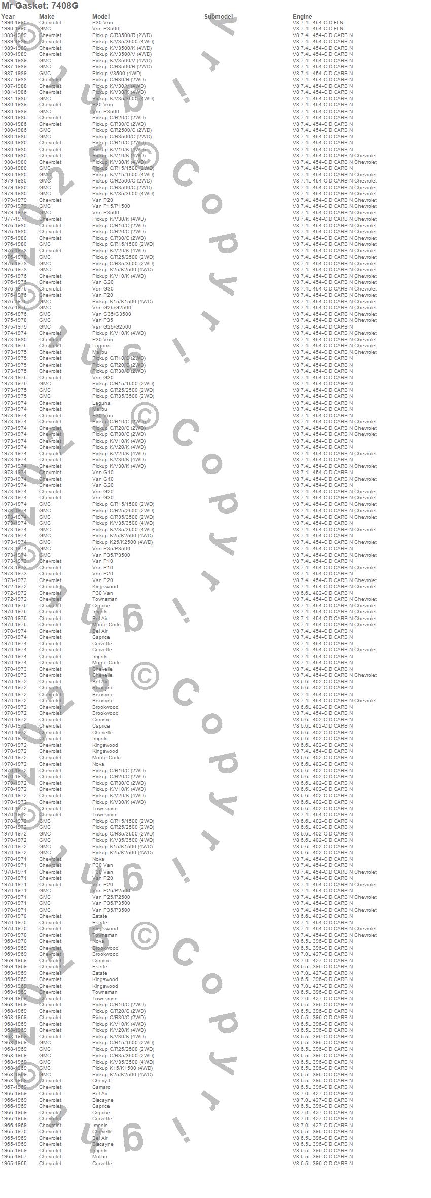Bel Air, Biscayne, Brookwood, C10 Pickup, C15/C1500, C1500, C20 Pickup, C25/C2500 Pickup, C2500 Pickup, C30 Pickup, C35/C3500 Pickup, C3500 Pickup, Camaro, Caprice, Chevelle, Chevy II, Corvette, Estate, G10 Van, G20 Van more…