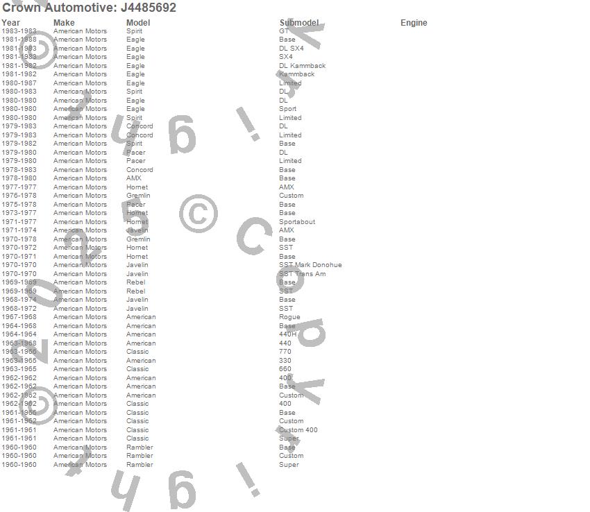 Crown Automotive is the premier manufacturer and distributor of quality replacement parts for Jeep® CJ™, Wrangler™, Cherokee™, Grand Cherokee™, Liberty™, and Commander™."From humble beginnings in 1963 in a small Boston storefront, Crown Automotive has consistently maintained its commitment to offering only quality parts and exceptional service. Today, with warehouses in Massachusetts, Georgia, Nevada, Spain, and the Czech Republic, totaling over 160,000 square feet, Crown Automotive continues to be the leader in quality replacement parts for Jeep® vehicles. With over 8,000 different parts in stock for Jeep® vehicles from 1942 on up, Crown has the largest stock of replacement parts for Jeep® vehicles, including factory-discontinued parts. In fact, many of the older Jeeps are still on (and off) the road thanks to Crown parts. The Crown line consists of axle, body, brake, clutch, cooling, driveline, electrical, engine, exhaust, fuel, steering, suspension, transmission and transfer case components. Crown Automotive also offers an exclusive line of component kits and accessory products. Because we know that Jeeps are driven harder than most other vehicles, we emphasize offering only quality parts. In fact, we test parts on Jeeps before distributing them to our dealers to insure that they meet our standards for quality. Crown also supports its entire line with a 12 month/12,000 mile warranty to insure our dealers and their customers of our commitment to offering quality parts. We know from experience that Jeep® owners would rather pay a little more for a good quality part that's backed by a strong guarantee. But we know that price is important as well. So, not only will you find Crown parts to be of exceptional quality, but you'll find them at a great price too.