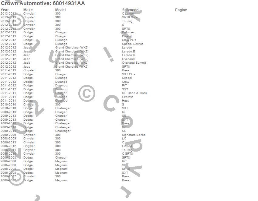300, Challenger, Charger, Durango, Grand Cherokee (WK2), Magnum, Chrysler, Dodge, Jeep, 2013, 2012, 2011, 2010, 2009, 2008, 2007, 2006 more…