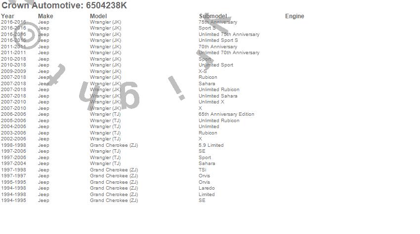 Crown Automotive is the premier manufacturer and distributor of quality replacement parts for Jeep® CJ™, Wrangler™, Cherokee™, Grand Cherokee™, Liberty™, and Commander™."From humble beginnings in 1963 in a small Boston storefront, Crown Automotive has consistently maintained its commitment to offering only quality parts and exceptional service. Today, with warehouses in Massachusetts, Georgia, Nevada, Spain, and the Czech Republic, totaling over 160,000 square feet, Crown Automotive continues to be the leader in quality replacement parts for Jeep® vehicles. With over 8,000 different parts in stock for Jeep® vehicles from 1942 on up, Crown has the largest stock of replacement parts for Jeep® vehicles, including factory-discontinued parts. In fact, many of the older Jeeps are still on (and off) the road thanks to Crown parts. The Crown line consists of axle, body, brake, clutch, cooling, driveline, electrical, engine, exhaust, fuel, steering, suspension, transmission and transfer case components. Crown Automotive also offers an exclusive line of component kits and accessory products. Because we know that Jeeps are driven harder than most other vehicles, we emphasize offering only quality parts. In fact, we test parts on Jeeps before distributing them to our dealers to insure that they meet our standards for quality. Crown also supports its entire line with a 12 month/12,000 mile warranty to insure our dealers and their customers of our commitment to offering quality parts. We know from experience that Jeep® owners would rather pay a little more for a good quality part that's backed by a strong guarantee. But we know that price is important as well. So, not only will you find Crown parts to be of exceptional quality, but you'll find them at a great price too.