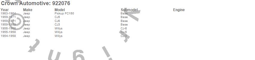 Crown Automotive is the premier manufacturer and distributor of quality replacement parts for Jeep® CJ™, Wrangler™, Cherokee™, Grand Cherokee™, Liberty™, and Commander™."From humble beginnings in 1963 in a small Boston storefront, Crown Automotive has consistently maintained its commitment to offering only quality parts and exceptional service. Today, with warehouses in Massachusetts, Georgia, Nevada, Spain, and the Czech Republic, totaling over 160,000 square feet, Crown Automotive continues to be the leader in quality replacement parts for Jeep® vehicles. With over 8,000 different parts in stock for Jeep® vehicles from 1942 on up, Crown has the largest stock of replacement parts for Jeep® vehicles, including factory-discontinued parts. In fact, many of the older Jeeps are still on (and off) the road thanks to Crown parts. The Crown line consists of axle, body, brake, clutch, cooling, driveline, electrical, engine, exhaust, fuel, steering, suspension, transmission and transfer case components. Crown Automotive also offers an exclusive line of component kits and accessory products. Because we know that Jeeps are driven harder than most other vehicles, we emphasize offering only quality parts. In fact, we test parts on Jeeps before distributing them to our dealers to insure that they meet our standards for quality. Crown also supports its entire line with a 12 month/12,000 mile warranty to insure our dealers and their customers of our commitment to offering quality parts. We know from experience that Jeep® owners would rather pay a little more for a good quality part that's backed by a strong guarantee. But we know that price is important as well. So, not only will you find Crown parts to be of exceptional quality, but you'll find them at a great price too.