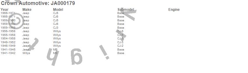 Crown Automotive is the premier manufacturer and distributor of quality replacement parts for Jeep® CJ™, Wrangler™, Cherokee™, Grand Cherokee™, Liberty™, and Commander™."From humble beginnings in 1963 in a small Boston storefront, Crown Automotive has consistently maintained its commitment to offering only quality parts and exceptional service. Today, with warehouses in Massachusetts, Georgia, Nevada, Spain, and the Czech Republic, totaling over 160,000 square feet, Crown Automotive continues to be the leader in quality replacement parts for Jeep® vehicles. With over 8,000 different parts in stock for Jeep® vehicles from 1942 on up, Crown has the largest stock of replacement parts for Jeep® vehicles, including factory-discontinued parts. In fact, many of the older Jeeps are still on (and off) the road thanks to Crown parts. The Crown line consists of axle, body, brake, clutch, cooling, driveline, electrical, engine, exhaust, fuel, steering, suspension, transmission and transfer case components. Crown Automotive also offers an exclusive line of component kits and accessory products. Because we know that Jeeps are driven harder than most other vehicles, we emphasize offering only quality parts. In fact, we test parts on Jeeps before distributing them to our dealers to insure that they meet our standards for quality. Crown also supports its entire line with a 12 month/12,000 mile warranty to insure our dealers and their customers of our commitment to offering quality parts. We know from experience that Jeep® owners would rather pay a little more for a good quality part that's backed by a strong guarantee. But we know that price is important as well. So, not only will you find Crown parts to be of exceptional quality, but you'll find them at a great price too.