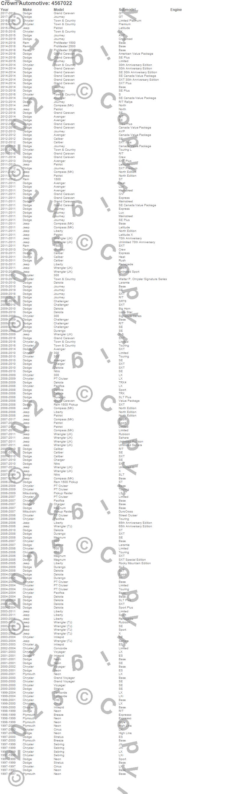 1500, 300, Avenger, Breeze, Caliber, Challenger, Charger, Cirrus, Compass, Concorde, Dakota, Durango, Grand Caravan, Grand Voyager, Intrepid, Journey, LHS, Liberty, Magnum, Neon more…