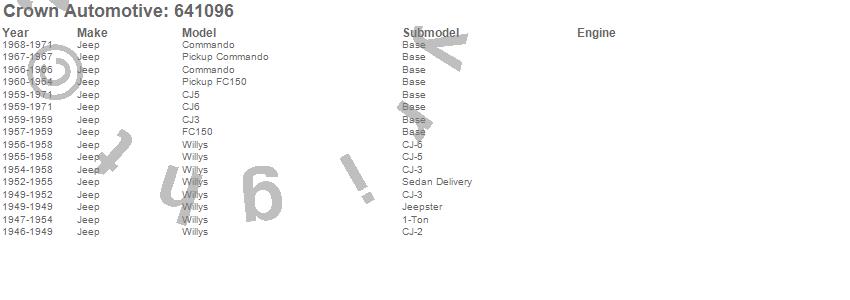 Crown Automotive is the premier manufacturer and distributor of quality replacement parts for Jeep® CJ™, Wrangler™, Cherokee™, Grand Cherokee™, Liberty™, and Commander™."From humble beginnings in 1963 in a small Boston storefront, Crown Automotive has consistently maintained its commitment to offering only quality parts and exceptional service. Today, with warehouses in Massachusetts, Georgia, Nevada, Spain, and the Czech Republic, totaling over 160,000 square feet, Crown Automotive continues to be the leader in quality replacement parts for Jeep® vehicles. With over 8,000 different parts in stock for Jeep® vehicles from 1942 on up, Crown has the largest stock of replacement parts for Jeep® vehicles, including factory-discontinued parts. In fact, many of the older Jeeps are still on (and off) the road thanks to Crown parts. The Crown line consists of axle, body, brake, clutch, cooling, driveline, electrical, engine, exhaust, fuel, steering, suspension, transmission and transfer case components. Crown Automotive also offers an exclusive line of component kits and accessory products. Because we know that Jeeps are driven harder than most other vehicles, we emphasize offering only quality parts. In fact, we test parts on Jeeps before distributing them to our dealers to insure that they meet our standards for quality. Crown also supports its entire line with a 12 month/12,000 mile warranty to insure our dealers and their customers of our commitment to offering quality parts. We know from experience that Jeep® owners would rather pay a little more for a good quality part that's backed by a strong guarantee. But we know that price is important as well. So, not only will you find Crown parts to be of exceptional quality, but you'll find them at a great price too.