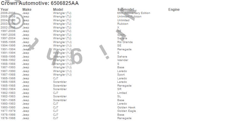 Crown Automotive is the premier manufacturer and distributor of quality replacement parts for Jeep® CJ™, Wrangler™, Cherokee™, Grand Cherokee™, Liberty™, and Commander™."From humble beginnings in 1963 in a small Boston storefront, Crown Automotive has consistently maintained its commitment to offering only quality parts and exceptional service. Today, with warehouses in Massachusetts, Georgia, Nevada, Spain, and the Czech Republic, totaling over 160,000 square feet, Crown Automotive continues to be the leader in quality replacement parts for Jeep® vehicles. With over 8,000 different parts in stock for Jeep® vehicles from 1942 on up, Crown has the largest stock of replacement parts for Jeep® vehicles, including factory-discontinued parts. In fact, many of the older Jeeps are still on (and off) the road thanks to Crown parts. The Crown line consists of axle, body, brake, clutch, cooling, driveline, electrical, engine, exhaust, fuel, steering, suspension, transmission and transfer case components. Crown Automotive also offers an exclusive line of component kits and accessory products. Because we know that Jeeps are driven harder than most other vehicles, we emphasize offering only quality parts. In fact, we test parts on Jeeps before distributing them to our dealers to insure that they meet our standards for quality. Crown also supports its entire line with a 12 month/12,000 mile warranty to insure our dealers and their customers of our commitment to offering quality parts. We know from experience that Jeep® owners would rather pay a little more for a good quality part that's backed by a strong guarantee. But we know that price is important as well. So, not only will you find Crown parts to be of exceptional quality, but you'll find them at a great price too.