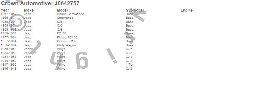 Crown Automotive is the premier manufacturer and distributor of quality replacement parts for Jeep® CJ™, Wrangler™, Cherokee™, Grand Cherokee™, Liberty™, and Commander™."From humble beginnings in 1963 in a small Boston storefront, Crown Automotive has consistently maintained its commitment to offering only quality parts and exceptional service. Today, with warehouses in Massachusetts, Georgia, Nevada, Spain, and the Czech Republic, totaling over 160,000 square feet, Crown Automotive continues to be the leader in quality replacement parts for Jeep® vehicles. With over 8,000 different parts in stock for Jeep® vehicles from 1942 on up, Crown has the largest stock of replacement parts for Jeep® vehicles, including factory-discontinued parts. In fact, many of the older Jeeps are still on (and off) the road thanks to Crown parts. The Crown line consists of axle, body, brake, clutch, cooling, driveline, electrical, engine, exhaust, fuel, steering, suspension, transmission and transfer case components. Crown Automotive also offers an exclusive line of component kits and accessory products. Because we know that Jeeps are driven harder than most other vehicles, we emphasize offering only quality parts. In fact, we test parts on Jeeps before distributing them to our dealers to insure that they meet our standards for quality. Crown also supports its entire line with a 12 month/12,000 mile warranty to insure our dealers and their customers of our commitment to offering quality parts. We know from experience that Jeep® owners would rather pay a little more for a good quality part that's backed by a strong guarantee. But we know that price is important as well. So, not only will you find Crown parts to be of exceptional quality, but you'll find them at a great price too.