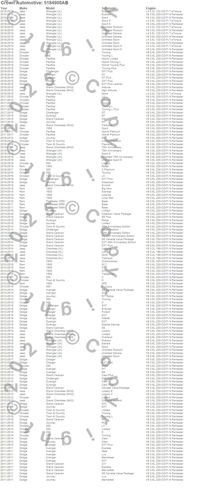 1500, 200, 300, Avenger, Challenger, Charger, Cherokee (KL), Durango, Grand Caravan, Grand Cherokee (WK2), Journey, ProMaster 1500, ProMaster 2500, ProMaster 3500, Town & Country, Wrangler (JK), Chrysler, Dodge, Jeep, Ram more…