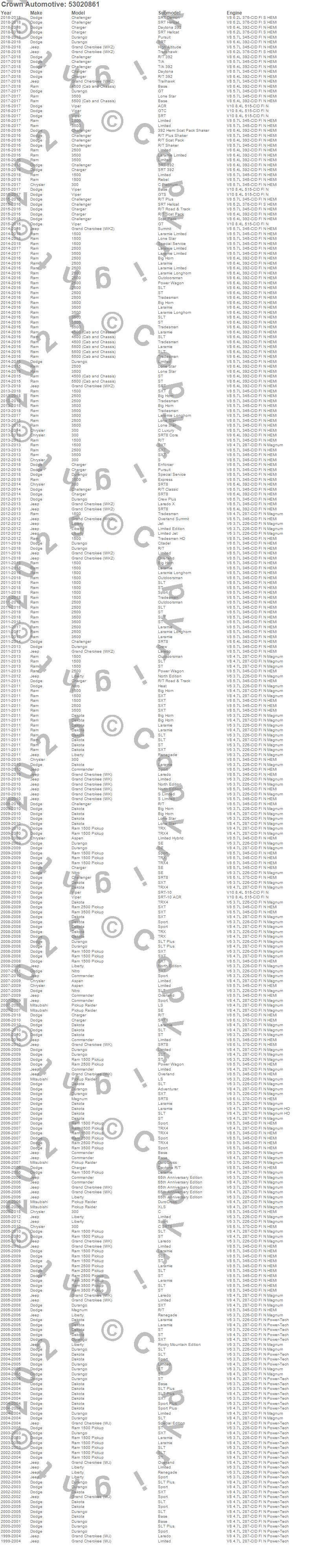 1500, 300, Aspen, Challenger, Charger, Commander, Dakota, Durango, Grand Cherokee (WJ), Grand Cherokee (WK), Grand Cherokee (WK2), Liberty, Magnum, Nitro, Raider, Ram 1500, Ram 2500, Ram 3500, Viper, Chrysler more…