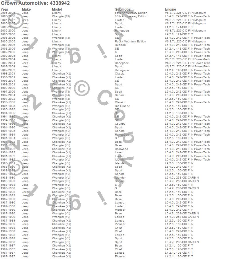 Crown Automotive is the premier manufacturer and distributor of quality replacement parts for Jeep® CJ™, Wrangler™, Cherokee™, Grand Cherokee™, Liberty™, and Commander™."From humble beginnings in 1963 in a small Boston storefront, Crown Automotive has consistently maintained its commitment to offering only quality parts and exceptional service. Today, with warehouses in Massachusetts, Georgia, Nevada, Spain, and the Czech Republic, totaling over 160,000 square feet, Crown Automotive continues to be the leader in quality replacement parts for Jeep® vehicles. With over 8,000 different parts in stock for Jeep® vehicles from 1942 on up, Crown has the largest stock of replacement parts for Jeep® vehicles, including factory-discontinued parts. In fact, many of the older Jeeps are still on (and off) the road thanks to Crown parts. The Crown line consists of axle, body, brake, clutch, cooling, driveline, electrical, engine, exhaust, fuel, steering, suspension, transmission and transfer case components. Crown Automotive also offers an exclusive line of component kits and accessory products. Because we know that Jeeps are driven harder than most other vehicles, we emphasize offering only quality parts. In fact, we test parts on Jeeps before distributing them to our dealers to insure that they meet our standards for quality. Crown also supports its entire line with a 12 month/12,000 mile warranty to insure our dealers and their customers of our commitment to offering quality parts. We know from experience that Jeep® owners would rather pay a little more for a good quality part that's backed by a strong guarantee. But we know that price is important as well. So, not only will you find Crown parts to be of exceptional quality, but you'll find them at a great price too.