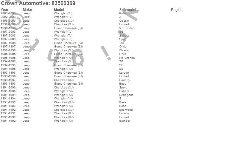 Crown Automotive is the premier manufacturer and distributor of quality replacement parts for Jeep® CJ™, Wrangler™, Cherokee™, Grand Cherokee™, Liberty™, and Commander™."From humble beginnings in 1963 in a small Boston storefront, Crown Automotive has consistently maintained its commitment to offering only quality parts and exceptional service. Today, with warehouses in Massachusetts, Georgia, Nevada, Spain, and the Czech Republic, totaling over 160,000 square feet, Crown Automotive continues to be the leader in quality replacement parts for Jeep® vehicles. With over 8,000 different parts in stock for Jeep® vehicles from 1942 on up, Crown has the largest stock of replacement parts for Jeep® vehicles, including factory-discontinued parts. In fact, many of the older Jeeps are still on (and off) the road thanks to Crown parts. The Crown line consists of axle, body, brake, clutch, cooling, driveline, electrical, engine, exhaust, fuel, steering, suspension, transmission and transfer case components. Crown Automotive also offers an exclusive line of component kits and accessory products. Because we know that Jeeps are driven harder than most other vehicles, we emphasize offering only quality parts. In fact, we test parts on Jeeps before distributing them to our dealers to insure that they meet our standards for quality. Crown also supports its entire line with a 12 month/12,000 mile warranty to insure our dealers and their customers of our commitment to offering quality parts. We know from experience that Jeep® owners would rather pay a little more for a good quality part that's backed by a strong guarantee. But we know that price is important as well. So, not only will you find Crown parts to be of exceptional quality, but you'll find them at a great price too.