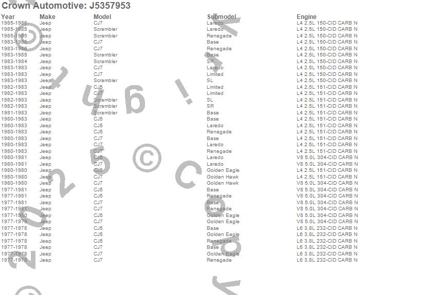 Crown Automotive is the premier manufacturer and distributor of quality replacement parts for Jeep® CJ™, Wrangler™, Cherokee™, Grand Cherokee™, Liberty™, and Commander™."From humble beginnings in 1963 in a small Boston storefront, Crown Automotive has consistently maintained its commitment to offering only quality parts and exceptional service. Today, with warehouses in Massachusetts, Georgia, Nevada, Spain, and the Czech Republic, totaling over 160,000 square feet, Crown Automotive continues to be the leader in quality replacement parts for Jeep® vehicles. With over 8,000 different parts in stock for Jeep® vehicles from 1942 on up, Crown has the largest stock of replacement parts for Jeep® vehicles, including factory-discontinued parts. In fact, many of the older Jeeps are still on (and off) the road thanks to Crown parts. The Crown line consists of axle, body, brake, clutch, cooling, driveline, electrical, engine, exhaust, fuel, steering, suspension, transmission and transfer case components. Crown Automotive also offers an exclusive line of component kits and accessory products. Because we know that Jeeps are driven harder than most other vehicles, we emphasize offering only quality parts. In fact, we test parts on Jeeps before distributing them to our dealers to insure that they meet our standards for quality. Crown also supports its entire line with a 12 month/12,000 mile warranty to insure our dealers and their customers of our commitment to offering quality parts. We know from experience that Jeep® owners would rather pay a little more for a good quality part that's backed by a strong guarantee. But we know that price is important as well. So, not only will you find Crown parts to be of exceptional quality, but you'll find them at a great price too.