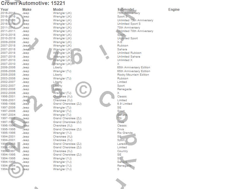 Crown Automotive is the premier manufacturer and distributor of quality replacement parts for Jeep® CJ™, Wrangler™, Cherokee™, Grand Cherokee™, Liberty™, and Commander™."From humble beginnings in 1963 in a small Boston storefront, Crown Automotive has consistently maintained its commitment to offering only quality parts and exceptional service. Today, with warehouses in Massachusetts, Georgia, Nevada, Spain, and the Czech Republic, totaling over 160,000 square feet, Crown Automotive continues to be the leader in quality replacement parts for Jeep® vehicles. With over 8,000 different parts in stock for Jeep® vehicles from 1942 on up, Crown has the largest stock of replacement parts for Jeep® vehicles, including factory-discontinued parts. In fact, many of the older Jeeps are still on (and off) the road thanks to Crown parts. The Crown line consists of axle, body, brake, clutch, cooling, driveline, electrical, engine, exhaust, fuel, steering, suspension, transmission and transfer case components. Crown Automotive also offers an exclusive line of component kits and accessory products. Because we know that Jeeps are driven harder than most other vehicles, we emphasize offering only quality parts. In fact, we test parts on Jeeps before distributing them to our dealers to insure that they meet our standards for quality. Crown also supports its entire line with a 12 month/12,000 mile warranty to insure our dealers and their customers of our commitment to offering quality parts. We know from experience that Jeep® owners would rather pay a little more for a good quality part that's backed by a strong guarantee. But we know that price is important as well. So, not only will you find Crown parts to be of exceptional quality, but you'll find them at a great price too.