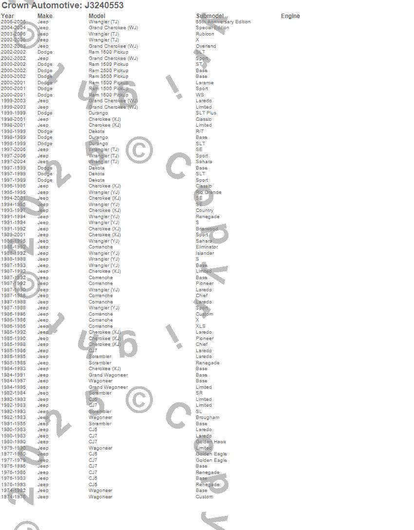 Cherokee (XJ), CJ5, CJ7, Comanche, Dakota, Durango, Grand Cherokee (WJ), Grand Wagoneer, Ram 1500, Ram 2500, Ram 3500, Scrambler, Wagoneer, Wrangler (TJ), Wrangler (YJ), Dodge, Jeep, 2006, 2005, 2004 more…