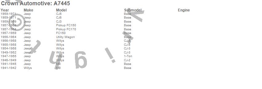 Crown Automotive is the premier manufacturer and distributor of quality replacement parts for Jeep® CJ™, Wrangler™, Cherokee™, Grand Cherokee™, Liberty™, and Commander™."From humble beginnings in 1963 in a small Boston storefront, Crown Automotive has consistently maintained its commitment to offering only quality parts and exceptional service. Today, with warehouses in Massachusetts, Georgia, Nevada, Spain, and the Czech Republic, totaling over 160,000 square feet, Crown Automotive continues to be the leader in quality replacement parts for Jeep® vehicles. With over 8,000 different parts in stock for Jeep® vehicles from 1942 on up, Crown has the largest stock of replacement parts for Jeep® vehicles, including factory-discontinued parts. In fact, many of the older Jeeps are still on (and off) the road thanks to Crown parts. The Crown line consists of axle, body, brake, clutch, cooling, driveline, electrical, engine, exhaust, fuel, steering, suspension, transmission and transfer case components. Crown Automotive also offers an exclusive line of component kits and accessory products. Because we know that Jeeps are driven harder than most other vehicles, we emphasize offering only quality parts. In fact, we test parts on Jeeps before distributing them to our dealers to insure that they meet our standards for quality. Crown also supports its entire line with a 12 month/12,000 mile warranty to insure our dealers and their customers of our commitment to offering quality parts. We know from experience that Jeep® owners would rather pay a little more for a good quality part that's backed by a strong guarantee. But we know that price is important as well. So, not only will you find Crown parts to be of exceptional quality, but you'll find them at a great price too.