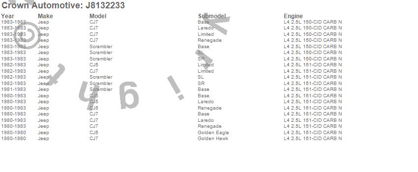 Crown Automotive is the premier manufacturer and distributor of quality replacement parts for Jeep® CJ™, Wrangler™, Cherokee™, Grand Cherokee™, Liberty™, and Commander™."From humble beginnings in 1963 in a small Boston storefront, Crown Automotive has consistently maintained its commitment to offering only quality parts and exceptional service. Today, with warehouses in Massachusetts, Georgia, Nevada, Spain, and the Czech Republic, totaling over 160,000 square feet, Crown Automotive continues to be the leader in quality replacement parts for Jeep® vehicles. With over 8,000 different parts in stock for Jeep® vehicles from 1942 on up, Crown has the largest stock of replacement parts for Jeep® vehicles, including factory-discontinued parts. In fact, many of the older Jeeps are still on (and off) the road thanks to Crown parts. The Crown line consists of axle, body, brake, clutch, cooling, driveline, electrical, engine, exhaust, fuel, steering, suspension, transmission and transfer case components. Crown Automotive also offers an exclusive line of component kits and accessory products. Because we know that Jeeps are driven harder than most other vehicles, we emphasize offering only quality parts. In fact, we test parts on Jeeps before distributing them to our dealers to insure that they meet our standards for quality. Crown also supports its entire line with a 12 month/12,000 mile warranty to insure our dealers and their customers of our commitment to offering quality parts. We know from experience that Jeep® owners would rather pay a little more for a good quality part that's backed by a strong guarantee. But we know that price is important as well. So, not only will you find Crown parts to be of exceptional quality, but you'll find them at a great price too.