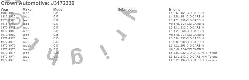 Crown Automotive is the premier manufacturer and distributor of quality replacement parts for Jeep® CJ™, Wrangler™, Cherokee™, Grand Cherokee™, Liberty™, and Commander™."From humble beginnings in 1963 in a small Boston storefront, Crown Automotive has consistently maintained its commitment to offering only quality parts and exceptional service. Today, with warehouses in Massachusetts, Georgia, Nevada, Spain, and the Czech Republic, totaling over 160,000 square feet, Crown Automotive continues to be the leader in quality replacement parts for Jeep® vehicles. With over 8,000 different parts in stock for Jeep® vehicles from 1942 on up, Crown has the largest stock of replacement parts for Jeep® vehicles, including factory-discontinued parts. In fact, many of the older Jeeps are still on (and off) the road thanks to Crown parts. The Crown line consists of axle, body, brake, clutch, cooling, driveline, electrical, engine, exhaust, fuel, steering, suspension, transmission and transfer case components. Crown Automotive also offers an exclusive line of component kits and accessory products. Because we know that Jeeps are driven harder than most other vehicles, we emphasize offering only quality parts. In fact, we test parts on Jeeps before distributing them to our dealers to insure that they meet our standards for quality. Crown also supports its entire line with a 12 month/12,000 mile warranty to insure our dealers and their customers of our commitment to offering quality parts. We know from experience that Jeep® owners would rather pay a little more for a good quality part that's backed by a strong guarantee. But we know that price is important as well. So, not only will you find Crown parts to be of exceptional quality, but you'll find them at a great price too.
