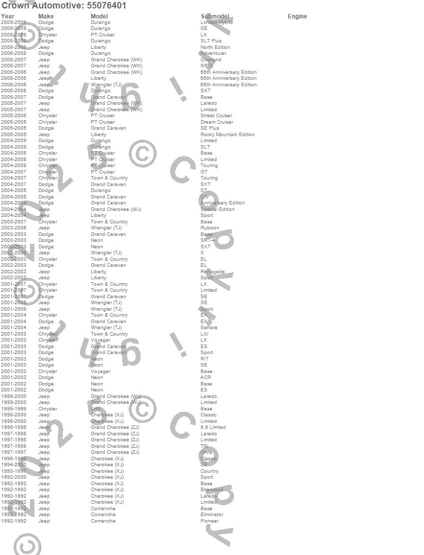 Cherokee (XJ), Comanche, Durango, Grand Caravan, Grand Cherokee (WJ), Grand Cherokee (WK), Grand Cherokee (ZJ), LHS, Liberty, Neon, PT Cruiser, Town & Country, Voyager, Wrangler (TJ), Chrysler, Dodge, Jeep, 2009, 2008, 2007 more…