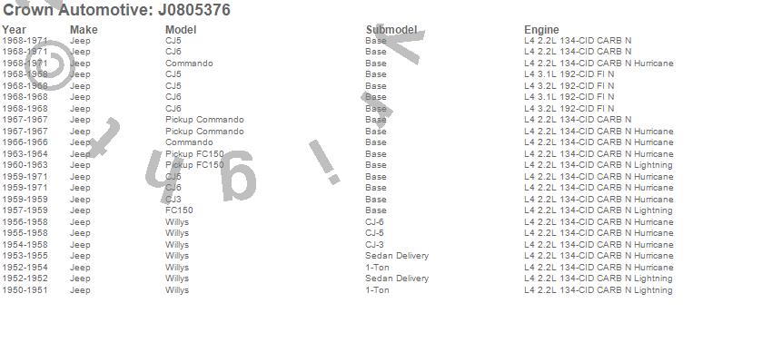 Crown Automotive is the premier manufacturer and distributor of quality replacement parts for Jeep® CJ™, Wrangler™, Cherokee™, Grand Cherokee™, Liberty™, and Commander™."From humble beginnings in 1963 in a small Boston storefront, Crown Automotive has consistently maintained its commitment to offering only quality parts and exceptional service. Today, with warehouses in Massachusetts, Georgia, Nevada, Spain, and the Czech Republic, totaling over 160,000 square feet, Crown Automotive continues to be the leader in quality replacement parts for Jeep® vehicles. With over 8,000 different parts in stock for Jeep® vehicles from 1942 on up, Crown has the largest stock of replacement parts for Jeep® vehicles, including factory-discontinued parts. In fact, many of the older Jeeps are still on (and off) the road thanks to Crown parts. The Crown line consists of axle, body, brake, clutch, cooling, driveline, electrical, engine, exhaust, fuel, steering, suspension, transmission and transfer case components. Crown Automotive also offers an exclusive line of component kits and accessory products. Because we know that Jeeps are driven harder than most other vehicles, we emphasize offering only quality parts. In fact, we test parts on Jeeps before distributing them to our dealers to insure that they meet our standards for quality. Crown also supports its entire line with a 12 month/12,000 mile warranty to insure our dealers and their customers of our commitment to offering quality parts. We know from experience that Jeep® owners would rather pay a little more for a good quality part that's backed by a strong guarantee. But we know that price is important as well. So, not only will you find Crown parts to be of exceptional quality, but you'll find them at a great price too.