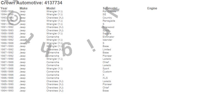 Crown Automotive is the premier manufacturer and distributor of quality replacement parts for Jeep® CJ™, Wrangler™, Cherokee™, Grand Cherokee™, Liberty™, and Commander™."From humble beginnings in 1963 in a small Boston storefront, Crown Automotive has consistently maintained its commitment to offering only quality parts and exceptional service. Today, with warehouses in Massachusetts, Georgia, Nevada, Spain, and the Czech Republic, totaling over 160,000 square feet, Crown Automotive continues to be the leader in quality replacement parts for Jeep® vehicles. With over 8,000 different parts in stock for Jeep® vehicles from 1942 on up, Crown has the largest stock of replacement parts for Jeep® vehicles, including factory-discontinued parts. In fact, many of the older Jeeps are still on (and off) the road thanks to Crown parts. The Crown line consists of axle, body, brake, clutch, cooling, driveline, electrical, engine, exhaust, fuel, steering, suspension, transmission and transfer case components. Crown Automotive also offers an exclusive line of component kits and accessory products. Because we know that Jeeps are driven harder than most other vehicles, we emphasize offering only quality parts. In fact, we test parts on Jeeps before distributing them to our dealers to insure that they meet our standards for quality. Crown also supports its entire line with a 12 month/12,000 mile warranty to insure our dealers and their customers of our commitment to offering quality parts. We know from experience that Jeep® owners would rather pay a little more for a good quality part that's backed by a strong guarantee. But we know that price is important as well. So, not only will you find Crown parts to be of exceptional quality, but you'll find them at a great price too.