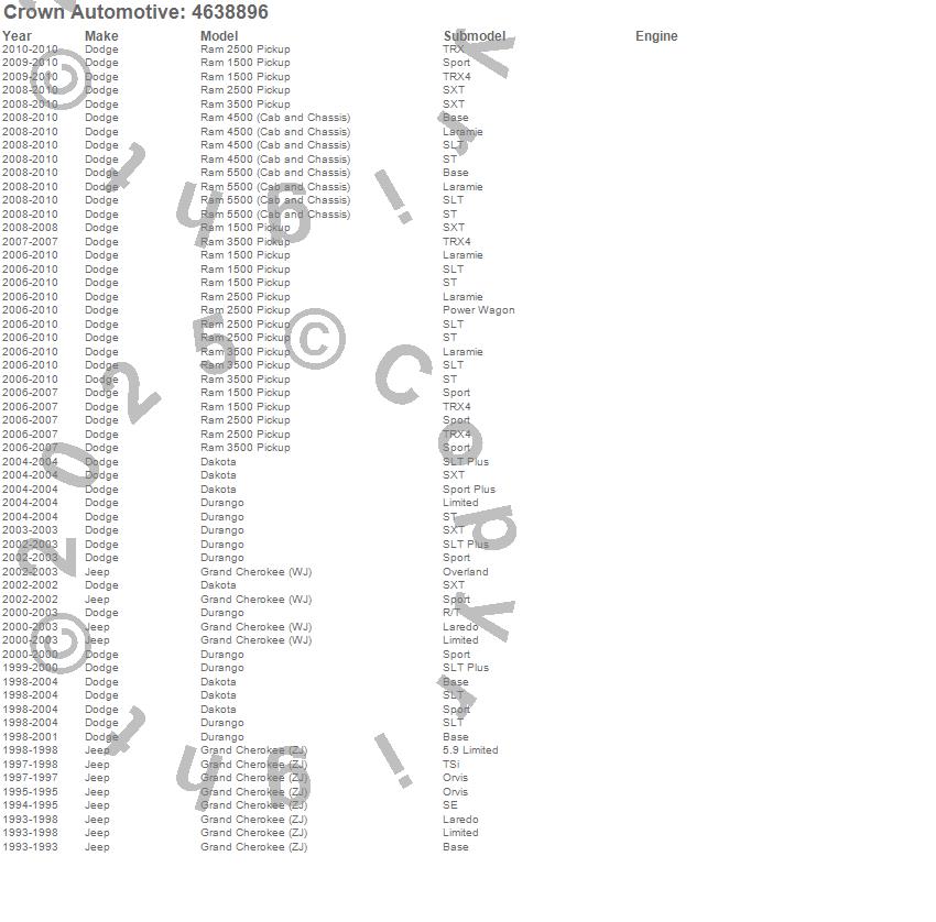 Dakota, Durango, Grand Cherokee (WJ), Grand Cherokee (ZJ), Ram 1500, Ram 2500, Ram 3500, Ram 4500, Ram 5500, Dodge, Jeep, 2010, 2009, 2008, 2007, 2006, 2004, 2003, 2002, 2001 more…
