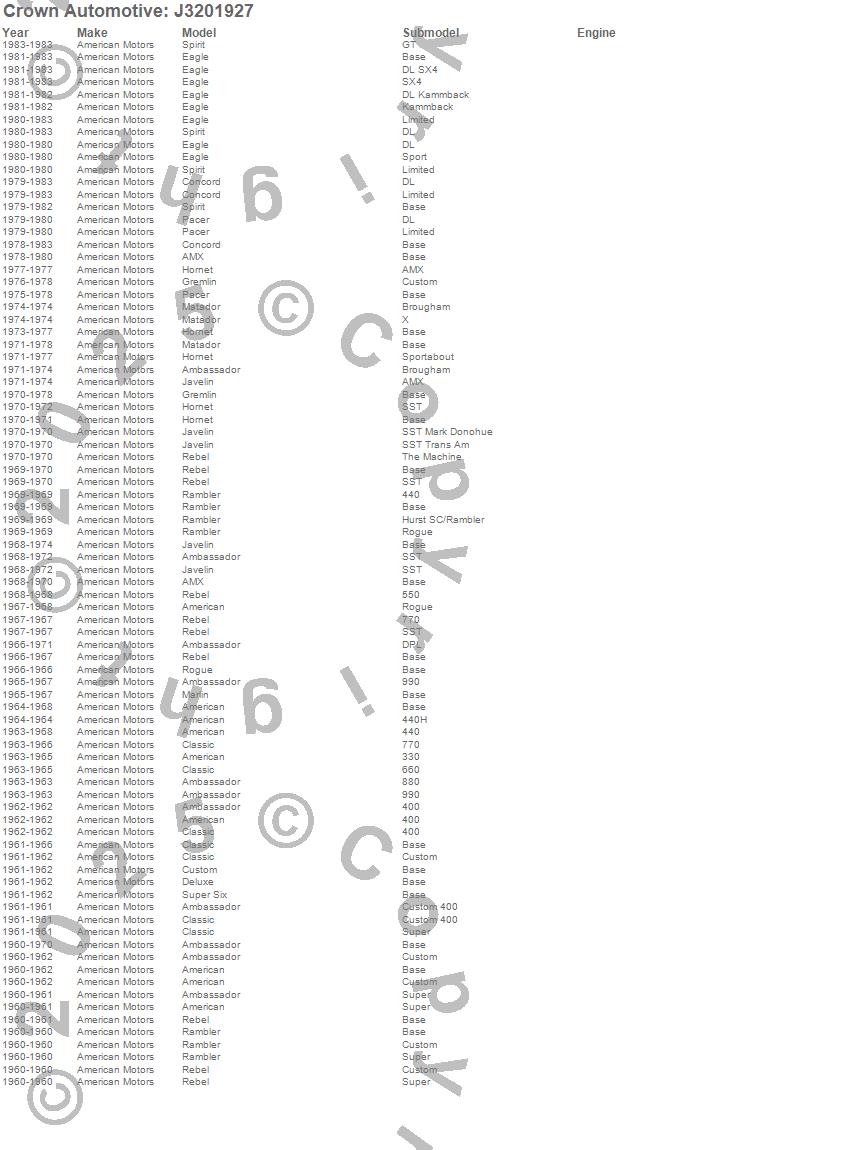 Ambassador, American, AMX, Classic, Concord, Custom, Deluxe, Eagle, Gremlin, Hornet, Javelin, Marlin, Matador, Pacer, Rambler, Rebel, Rogue, Spirit, Super Six, American Motors more…