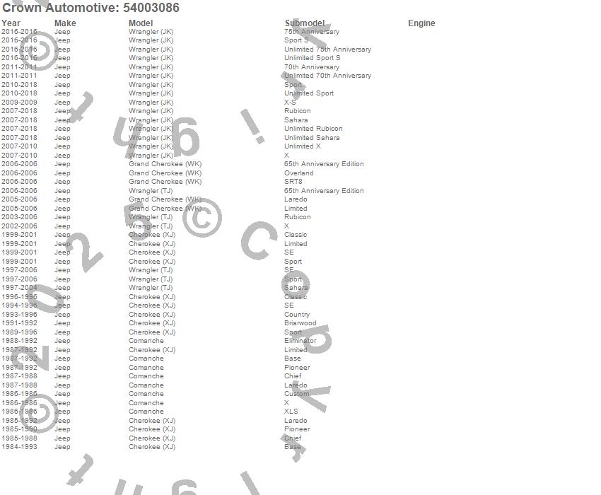 Crown Automotive is the premier manufacturer and distributor of quality replacement parts for Jeep® CJ™, Wrangler™, Cherokee™, Grand Cherokee™, Liberty™, and Commander™."From humble beginnings in 1963 in a small Boston storefront, Crown Automotive has consistently maintained its commitment to offering only quality parts and exceptional service. Today, with warehouses in Massachusetts, Georgia, Nevada, Spain, and the Czech Republic, totaling over 160,000 square feet, Crown Automotive continues to be the leader in quality replacement parts for Jeep® vehicles. With over 8,000 different parts in stock for Jeep® vehicles from 1942 on up, Crown has the largest stock of replacement parts for Jeep® vehicles, including factory-discontinued parts. In fact, many of the older Jeeps are still on (and off) the road thanks to Crown parts. The Crown line consists of axle, body, brake, clutch, cooling, driveline, electrical, engine, exhaust, fuel, steering, suspension, transmission and transfer case components. Crown Automotive also offers an exclusive line of component kits and accessory products. Because we know that Jeeps are driven harder than most other vehicles, we emphasize offering only quality parts. In fact, we test parts on Jeeps before distributing them to our dealers to insure that they meet our standards for quality. Crown also supports its entire line with a 12 month/12,000 mile warranty to insure our dealers and their customers of our commitment to offering quality parts. We know from experience that Jeep® owners would rather pay a little more for a good quality part that's backed by a strong guarantee. But we know that price is important as well. So, not only will you find Crown parts to be of exceptional quality, but you'll find them at a great price too.